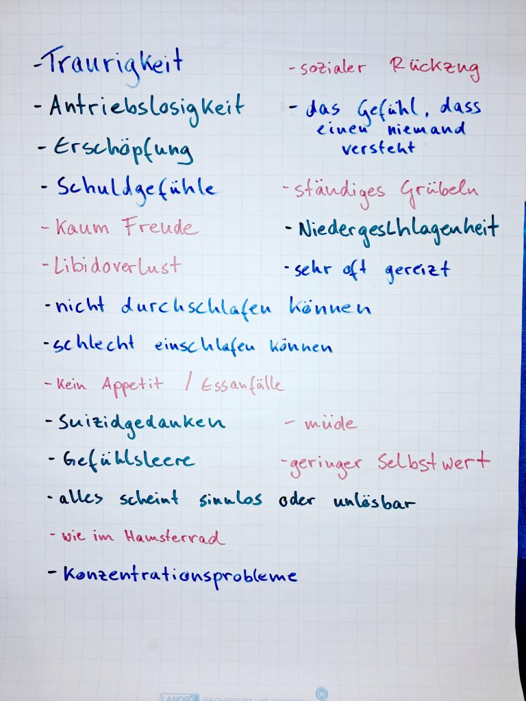 In einer Tagesklinik ist folgendes Schaubild zusammen getragen worden als die Teilnehmerinnen gefragt wurden, wie es ihnen mit ihrer Depression geht:
