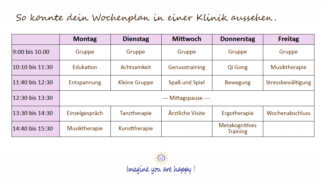 Beispielhaft findest du hier einen Wochenplan einer Tagesklinik: